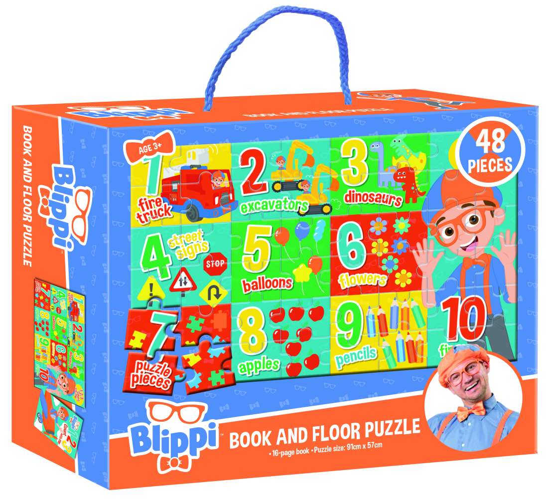 With his signature blue and orange outfit, Blippi takes preschoolers on interactive and educational adventures. He is always ready to teach new lessons with his notably energetic style. This carry-along box contains a large floor puzzle, suitable for ages 3+, with an accompanying colouring book. Both focussed on early recognition of numbers and one-to-one correspondence, through fun and play.